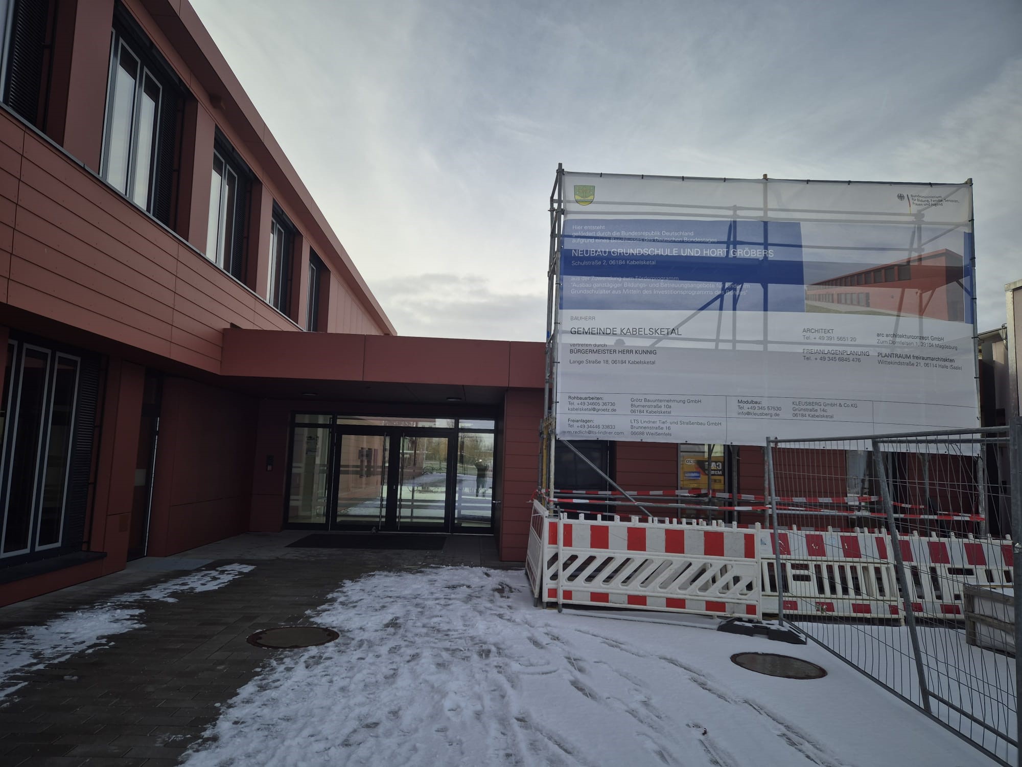 Der Grundschul- und Hortneubau Gröbers ist fertiggestellt, die Gestaltung der Außenanlagen schreitet voran. Eine Fertigstellung der Außenanalgen wird bis ca. April 2026 erwartet.